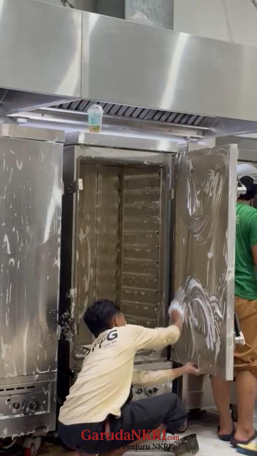 Pantauan di lokasi, para relawan tampak bekerja bersama membersihkan seluruh area dapur. Sejumlah petugas tampak mengepel lantai, sementara lainnya mencuci berbagai peralatan masak. Meja pemorsian juga dibersihkan dan dilap hingga siap digunakan.