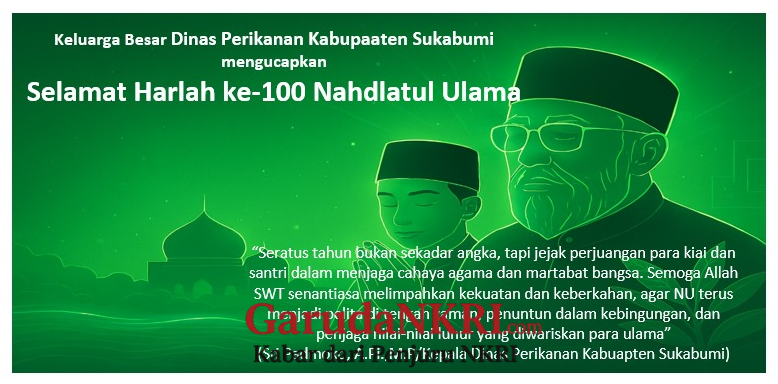 GarudaNKRI.com,- Sukabumi, 31 Januari 2026 – Dalam semangat Sukabumi Mubarokah yang menjiwai gerak pembangunan daerah dan spiritualitas masyarakat, Keluarga Besar Dinas Perikanan Kabupaten Sukabumi menyampaikan penghormatan dan doa terbaik bagi Nahdlatul Ulama yang kini genap berusia satu abad. Seratus tahun NU bukan hanya sejarah, tetapi warisan perjuangan yang hidup dalam jiwa para kiai, santri, dan umat yang mencintai negeri ini.