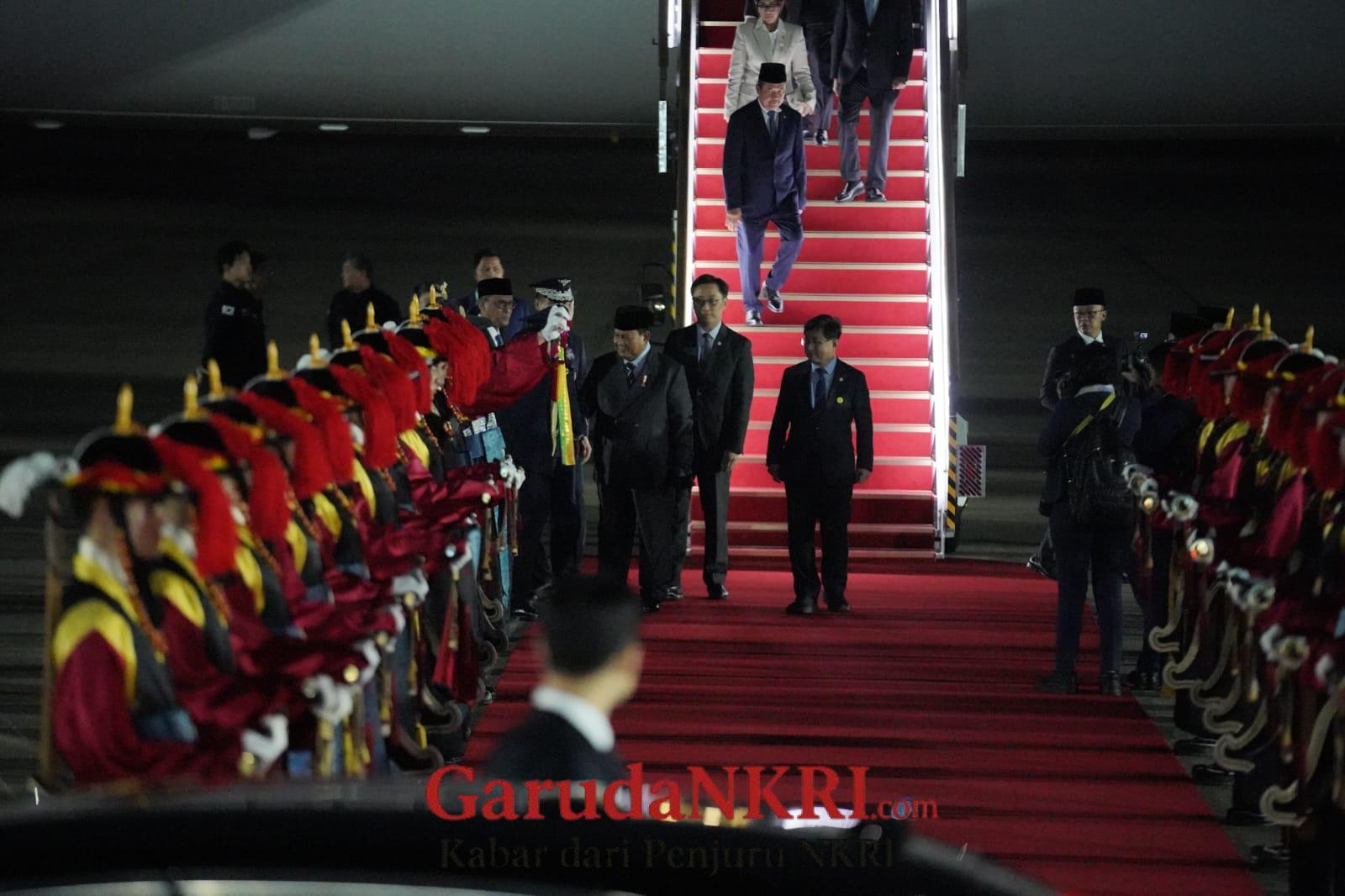 Kedatangan Presiden Prabowo disambut hangat oleh sejumlah pasukan jajar kehormatan dan para pejabat Pemerintah Republik Korea serta perwakilan Republik Indonesia.